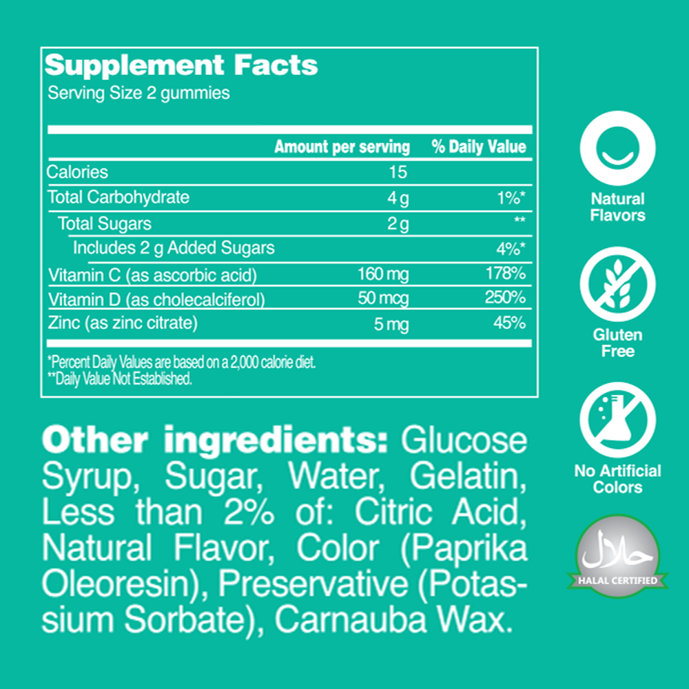 - Shield your immune system with Vitamin C, D, and Zinc packed into each gummy.