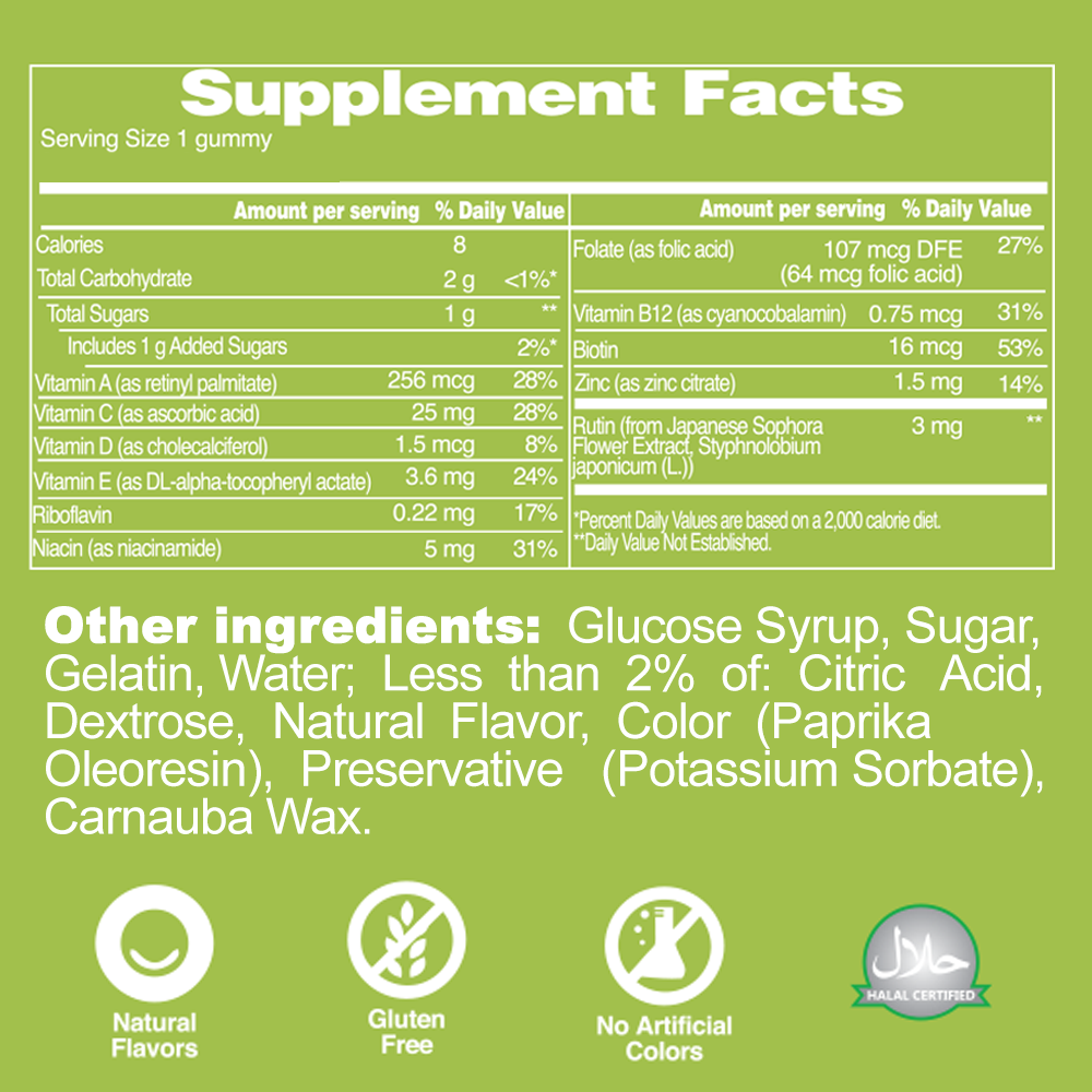 Glucose syrup, sugar, gelatin, water, retynyl palmitate, ascorbic acid, cholecalciferol, DL-alpha tocopheryl acetate, riboflavin, niacin, folate, vitamin B12, biotin, zinc, rutin, citric acid, dextrose, natural flavor, color (paprika oleoresin), preservative (potassium sorbate), carnauba wax.