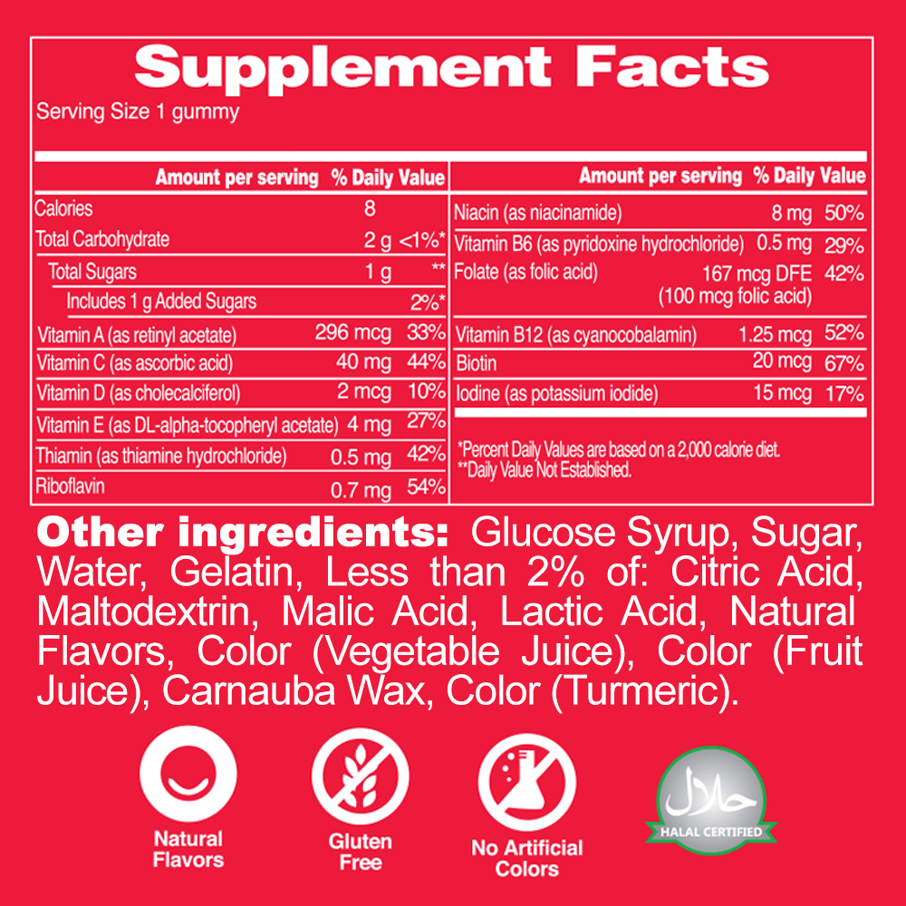 Glucose syrup, sugar, water, gelatin, vitamin A, vitamin C, vitamin D, vitamin E, Thiamin, Riboflavin, Niacin, Vitamin B6, Vitamin B12, Biotin, potassium iodide, citric acid, maltodextrin, malic acid, lactic acid, natural flavors, color (vegetable juice), carnauba wax, color (turmeric).